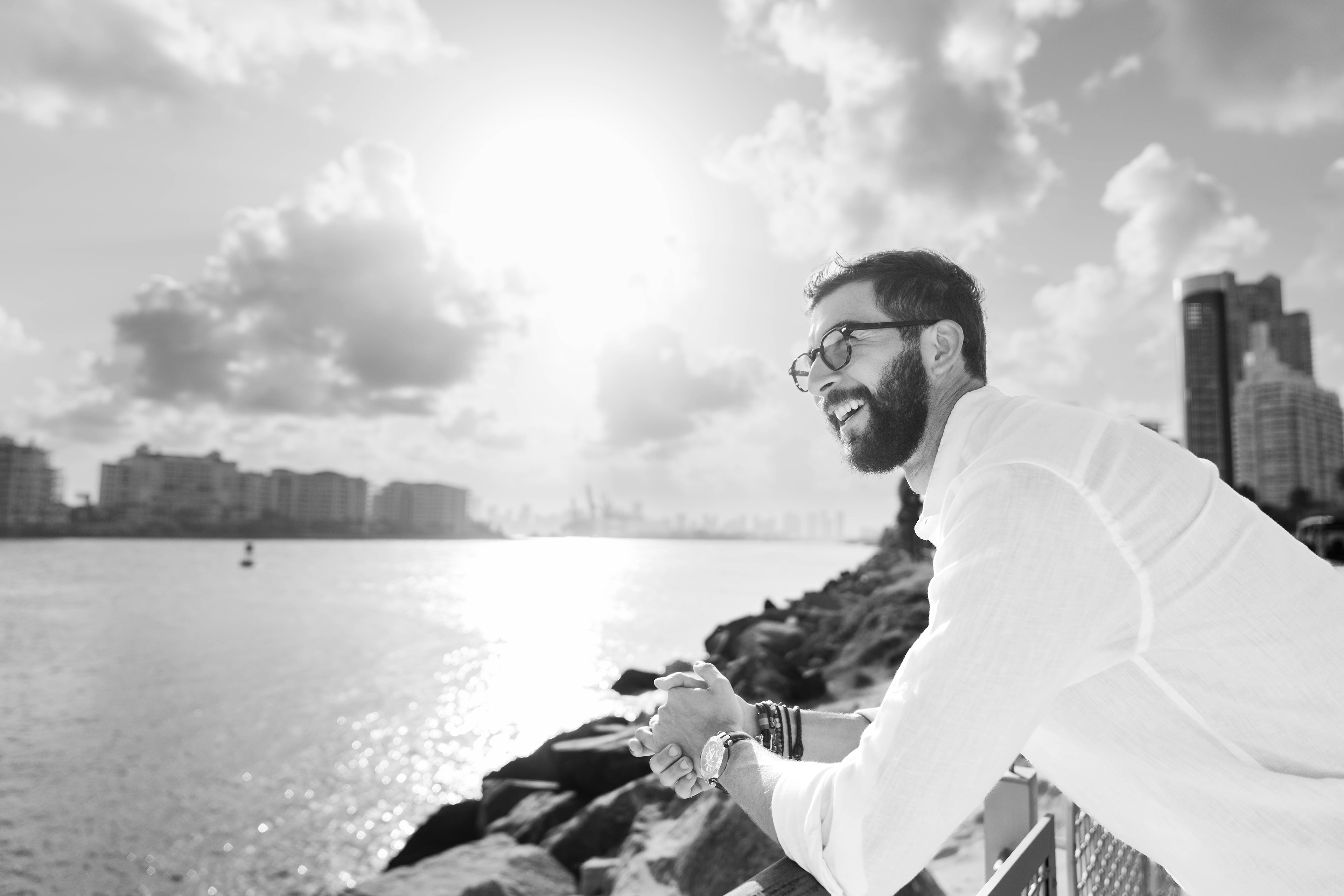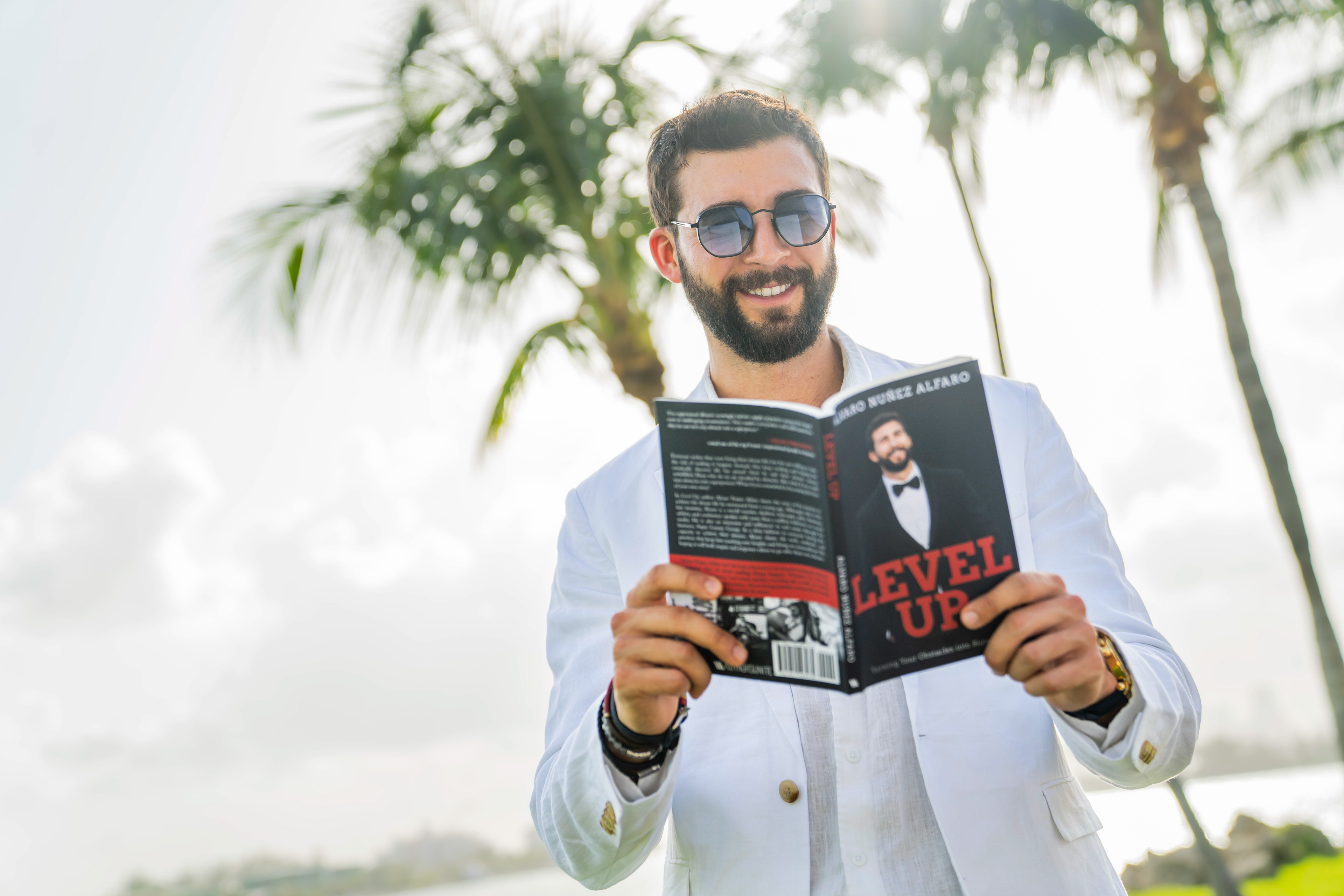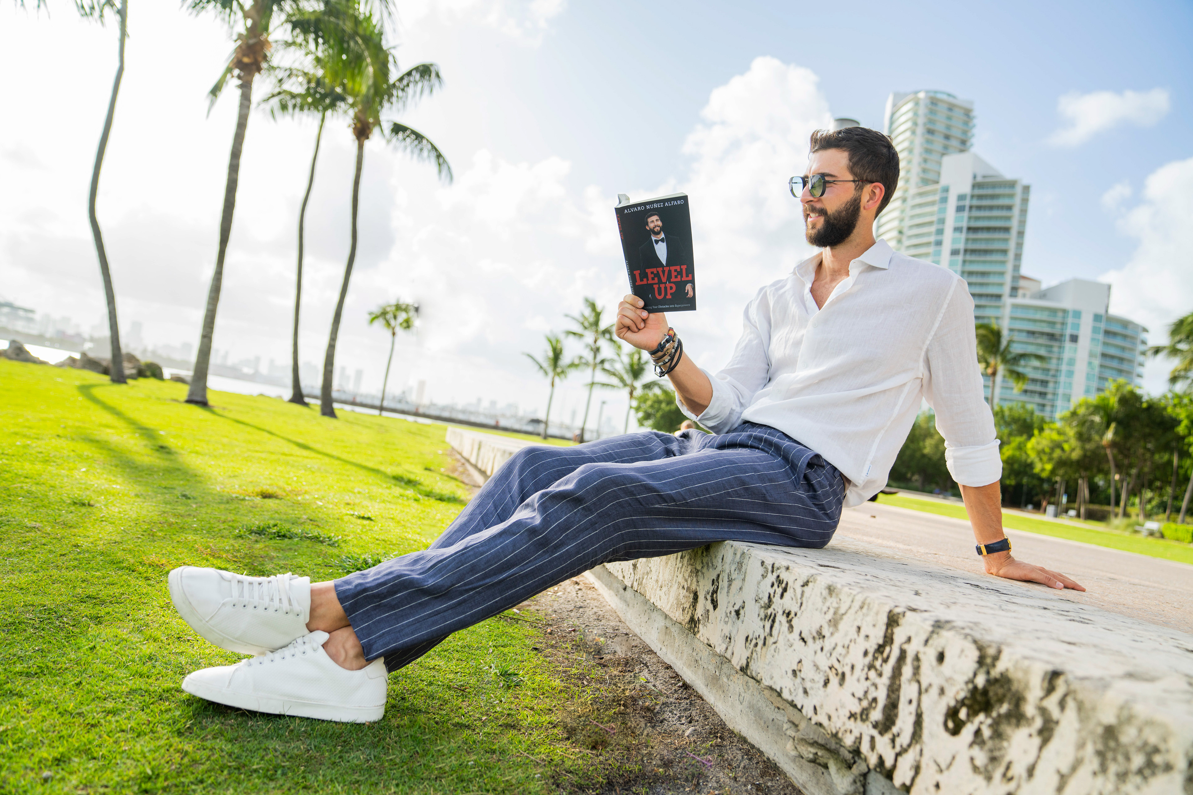 Experience the essence of Alvaro's boundless journey through captivating photographs by Julian Osorio, showcasing him and his book against the vibrant backdrop of Miami Beach.